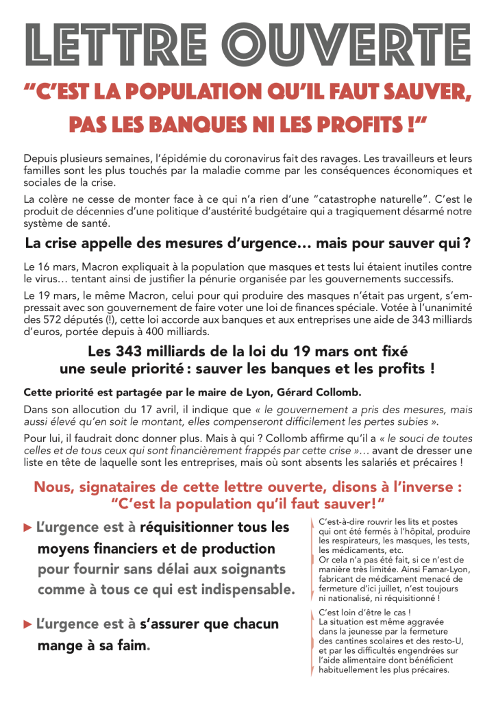 Téléchargez et faites connaître la Lettre ouverte « C’est la population qu’il faut sauver, pas les banques ni les profits ! » initiée par LYON 100% SOCIAL !