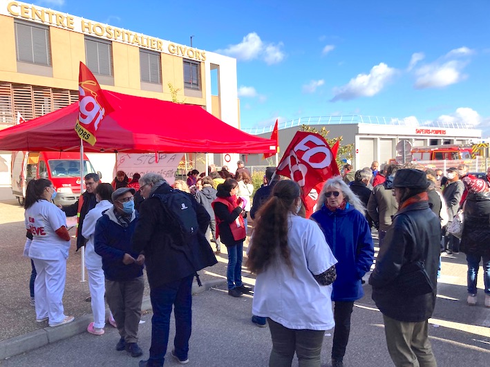 Le 8 novembre, plusieurs dizaines de personnes se sont rassemblés devant le Centre hospitalier de Givors (Rhône) contre la fermeture des urgences de nuit, avec le syndicat CGT de l’hôpital et des délégations CGT et FO d’autres hôpitaux et de plusieurs secteurs professionnels venus avec les unions locales.
