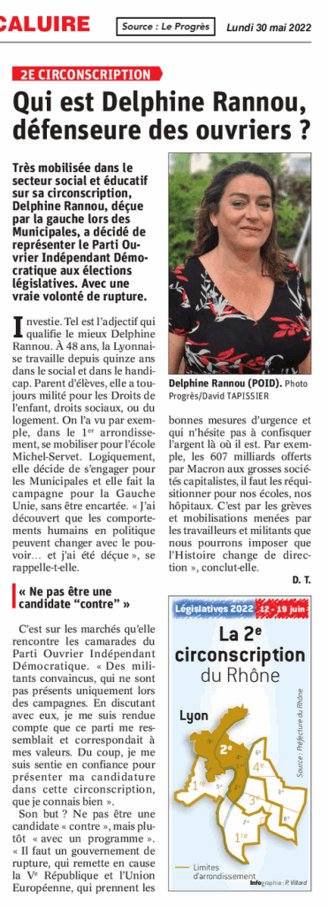 Si beaucoup de media se limitent à citer les candidats du POID aux élections législatives dans les circonscriptions du Rhône, le journal régional Le Progrès leur a lui donné la parole plus largement, comme c’est le cas pour Delphine Rannou avec un article de présentation et une vidéo, à retrouver sur leur site et ci-dessous.