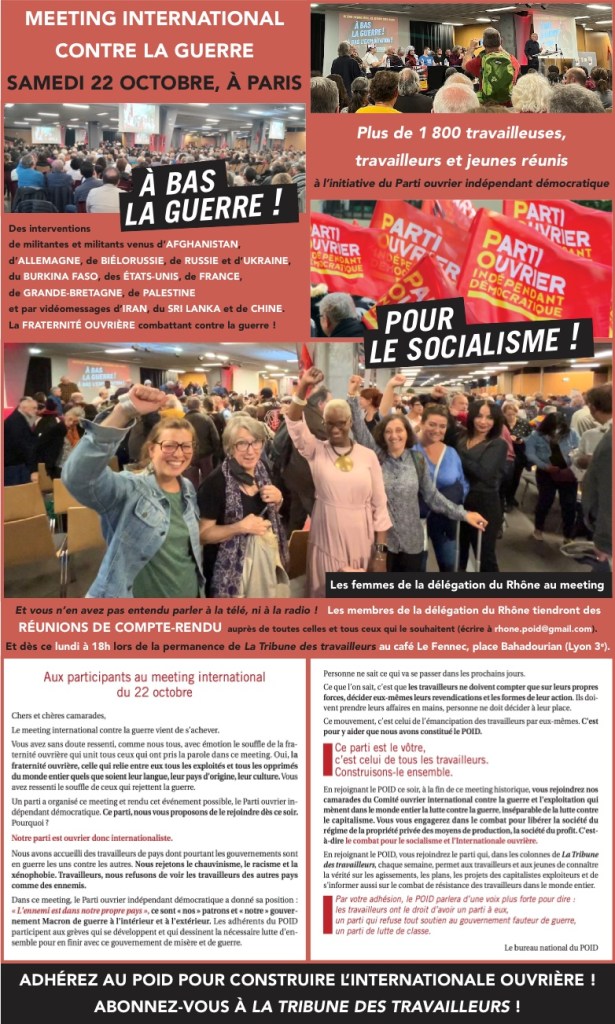 La Tribune des travailleurs n°362 (26 octobre) publie un très large compte-rendu du meeting international contre la guerre du 22 octobre 2022.